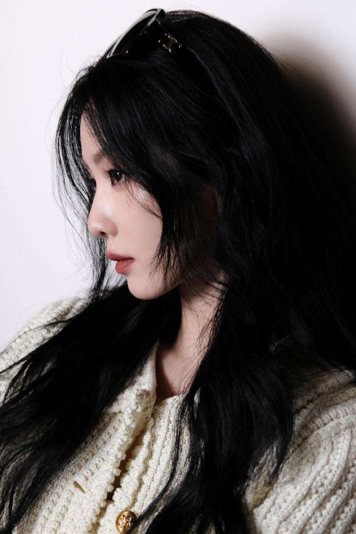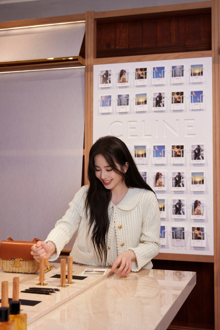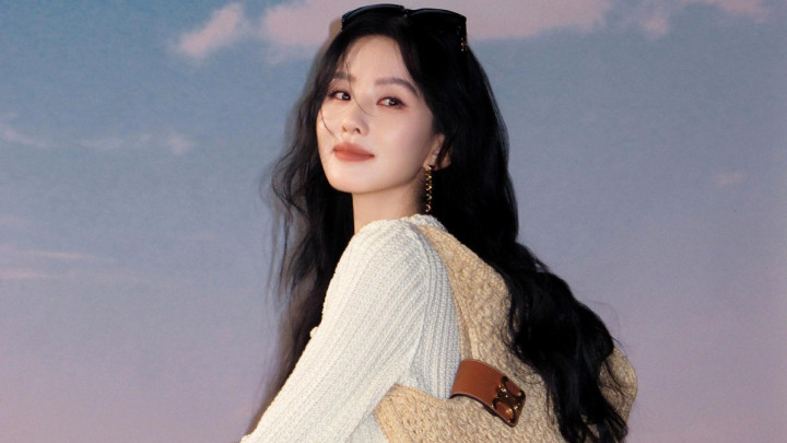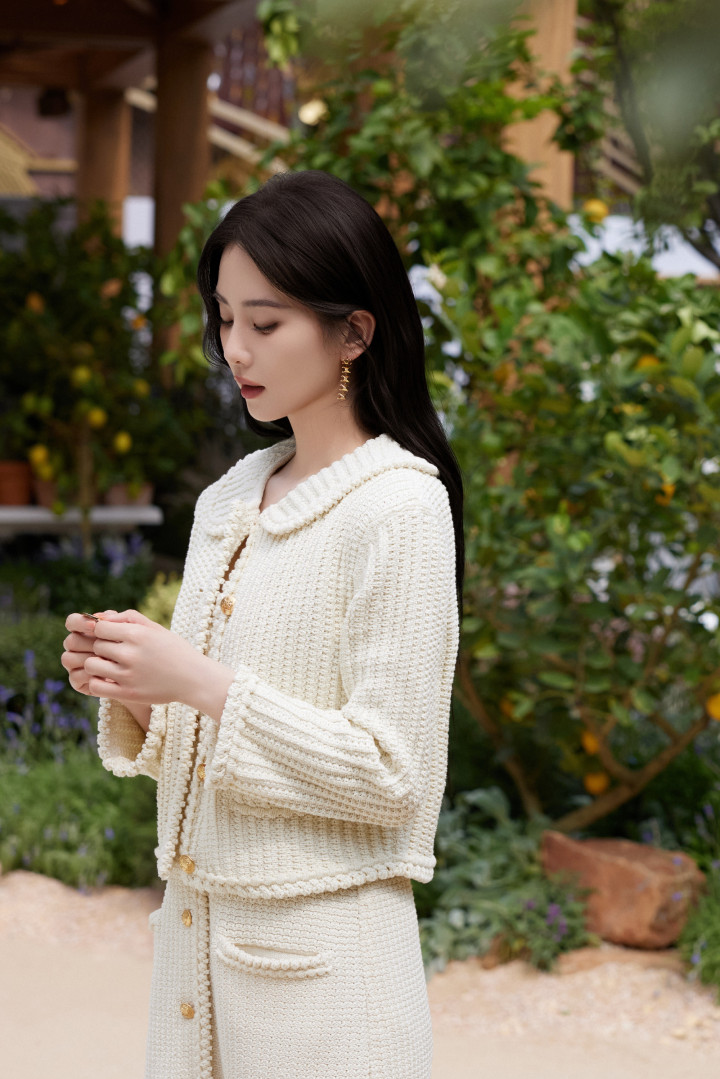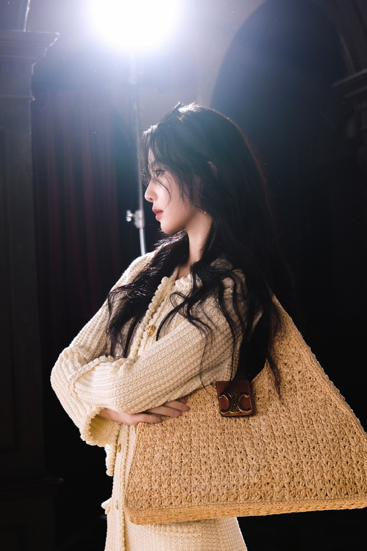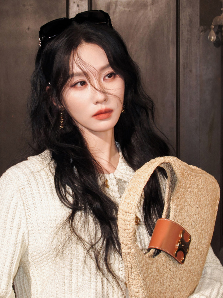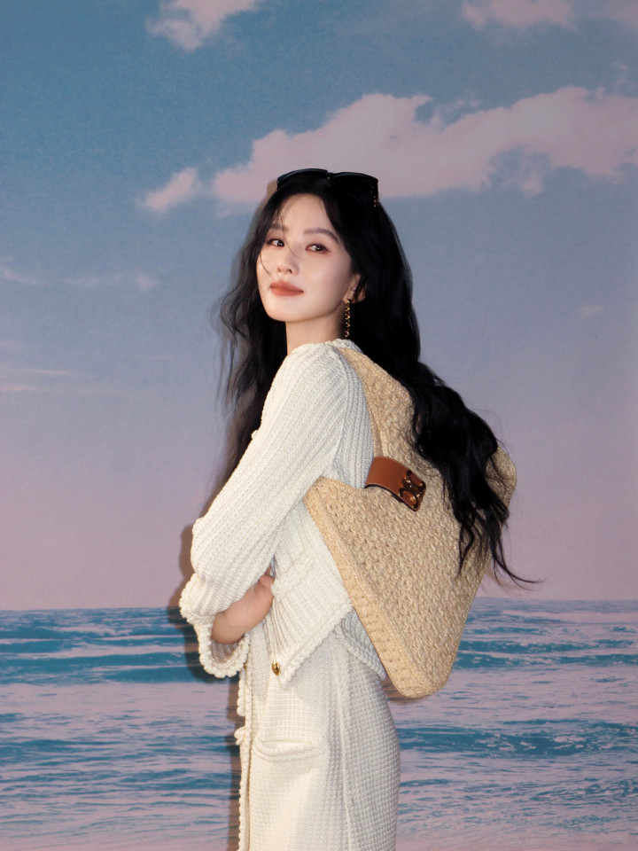 刘诗诗米白针织杀! 花边领口勾慵懒, 草编包焊死休闲氛围感